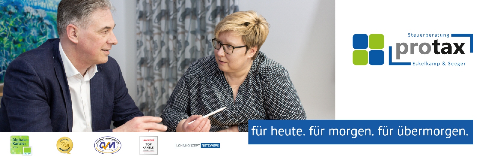 Im März 2024 haben wir aus der Nüvemann und Willich Steuerberater PartGmbB die ProTax Steuerberatung PartGmbB mit den Partnern Tanja Eckelkamp und Josef Seeger firmiert. Mit diesem Schritt schließen wir den Übergangsprozess von der damaligen Einzelkanzlei hin zur heutigen Partnerschaftsgesellschaft ab und sind für Sie als unsere Mandanten optimal aufgestellt. So starten wir getreu unserem Motto: für heute. für morgen. für übermorgen in das Jahr 2024 mit unserem neuen Namen ProTax Steuerberatung.