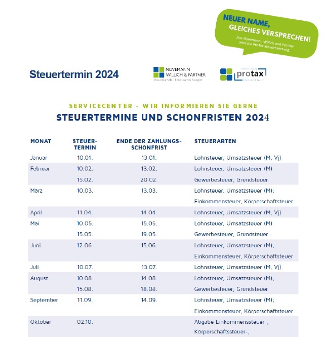 Im Steuertermin-Kalender finden Sie alle Termine für die Abgabe Ihrer Steuererklärungen und sämtliche Termine für Ihre Steuervorauszahlungen. Fällt ein vom Gesetzgeber festgelegter Termin auf einen Samstag, Sonntag oder gesetzlichen Feiertag, verschiebt sich dieser auf den nächsten Werktag. Rechtzeitig ist die Abgabe einer Steuererklärung dann, wenn sie dem Finanzamt vor Ablauf der Abgabefrist vorliegt. Geht dem Finanzamt die Erklärung verspätet zu, kann ein Verspätungszuschlag festgesetzt werden (§ 152 AO).
